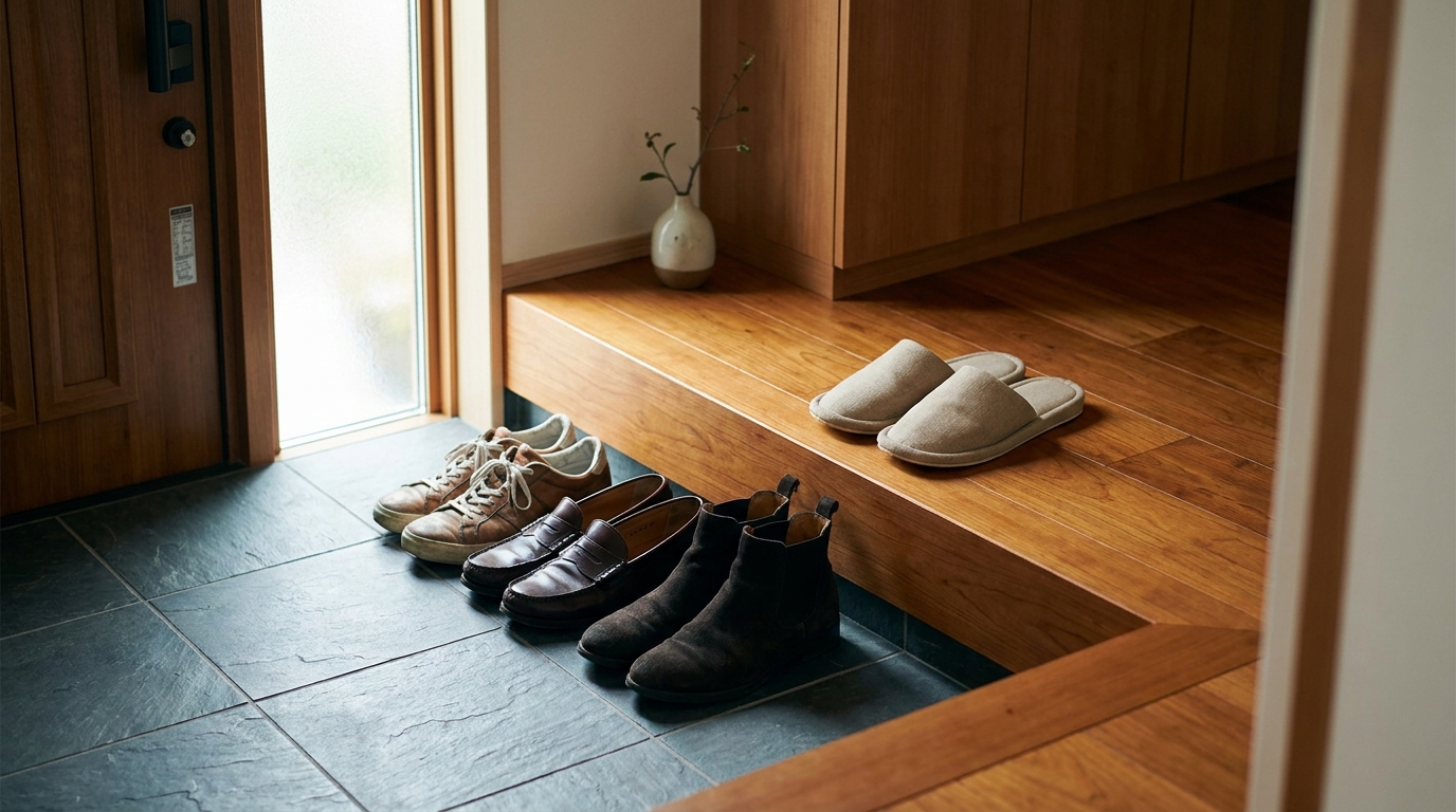 - Placing shoes on the upper floor. Shoes belong in the tataki (lower entry area) or in the shoe cabinet. Never carry them up onto the indoor floor.